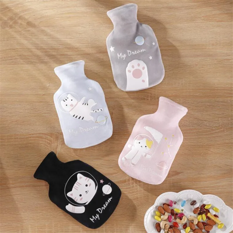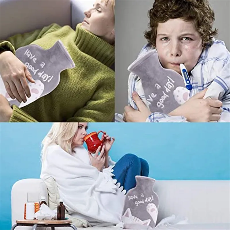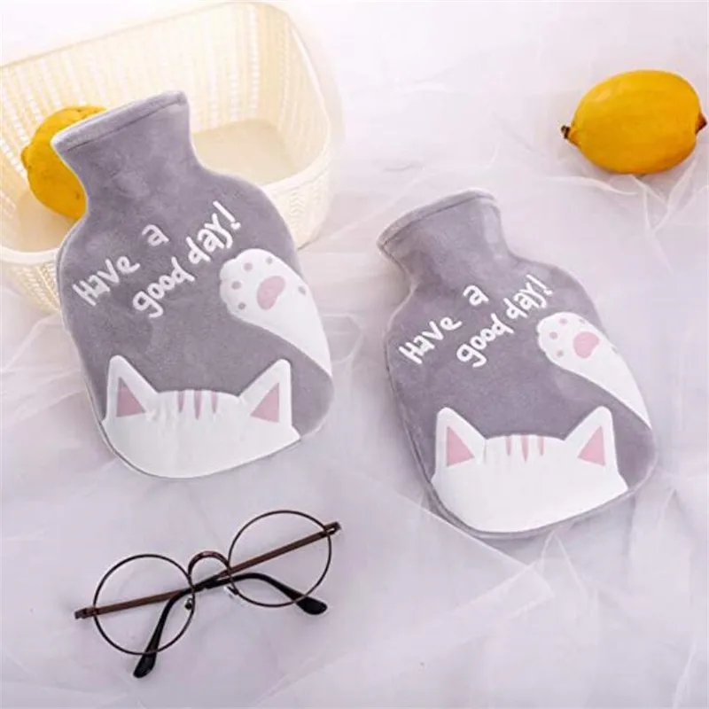 350ML Safe Hot Water Bottle Cat Soft Warm Winter Portable Reusable Protective with Plush Cover Washable Leak Proof Pain Relief